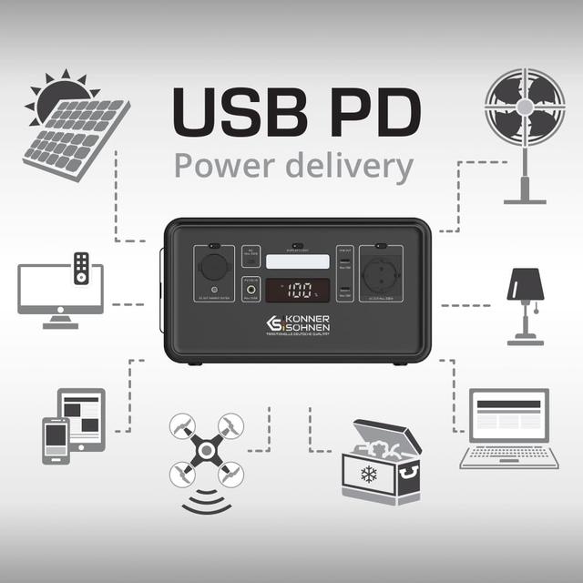 Зарядна станція Konner&Sohnen KS 1200PS підтримує USB PD (Power Delivery), завдяки чому можна максимально швидко зарядити смартфони, планшети, телевізори тощо. без спеціальних адаптерів.